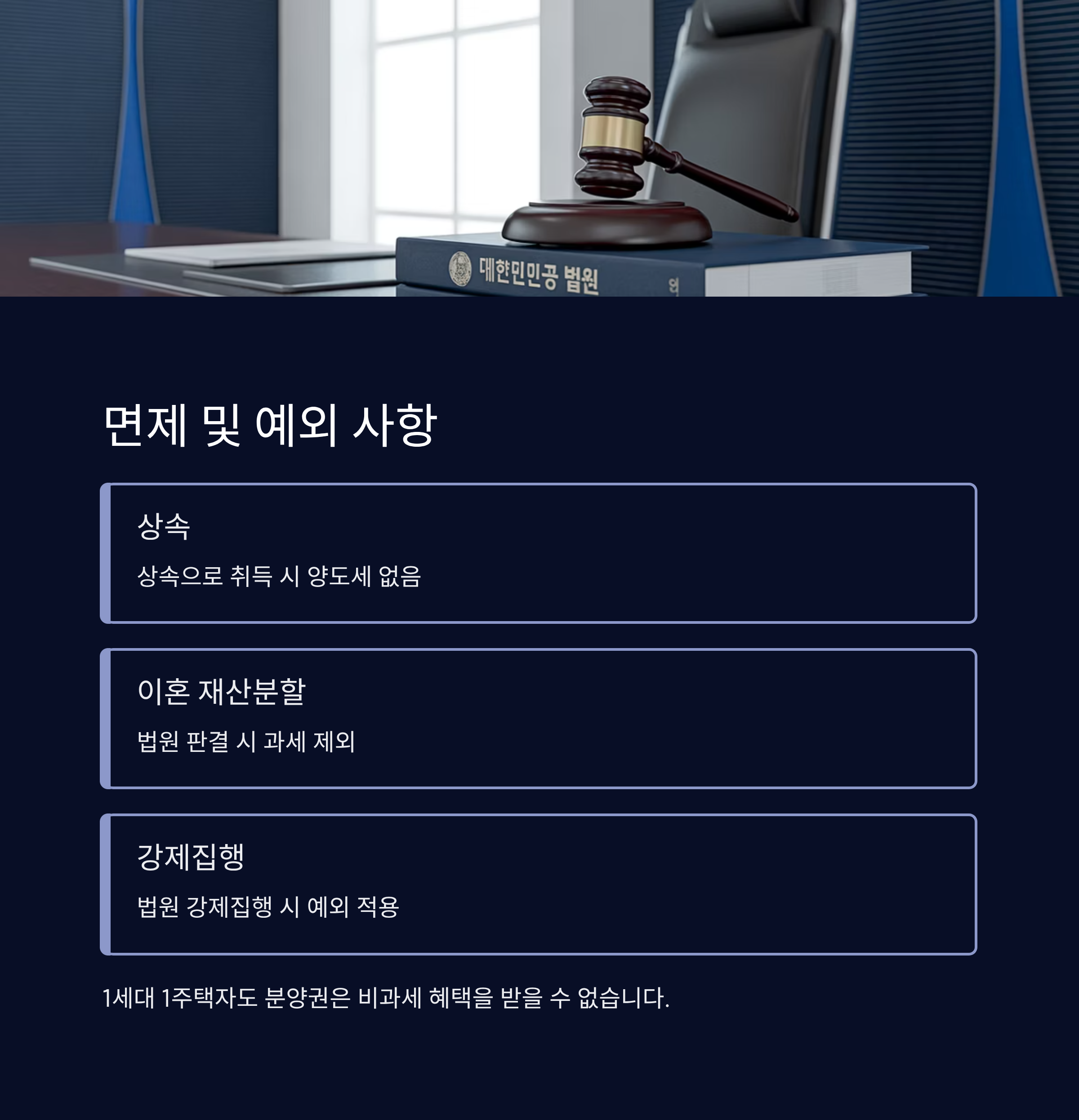 두 번째는 이혼 시 재산 분할로 인한 이전이에요. 이 경우도 ‘양도’로 보지 않기 때문에 양도세가 발생하지 않아요. 이외에도 법원이 강제집행을 통해 명의를 이전하는 경우도 예외에 해당해요.