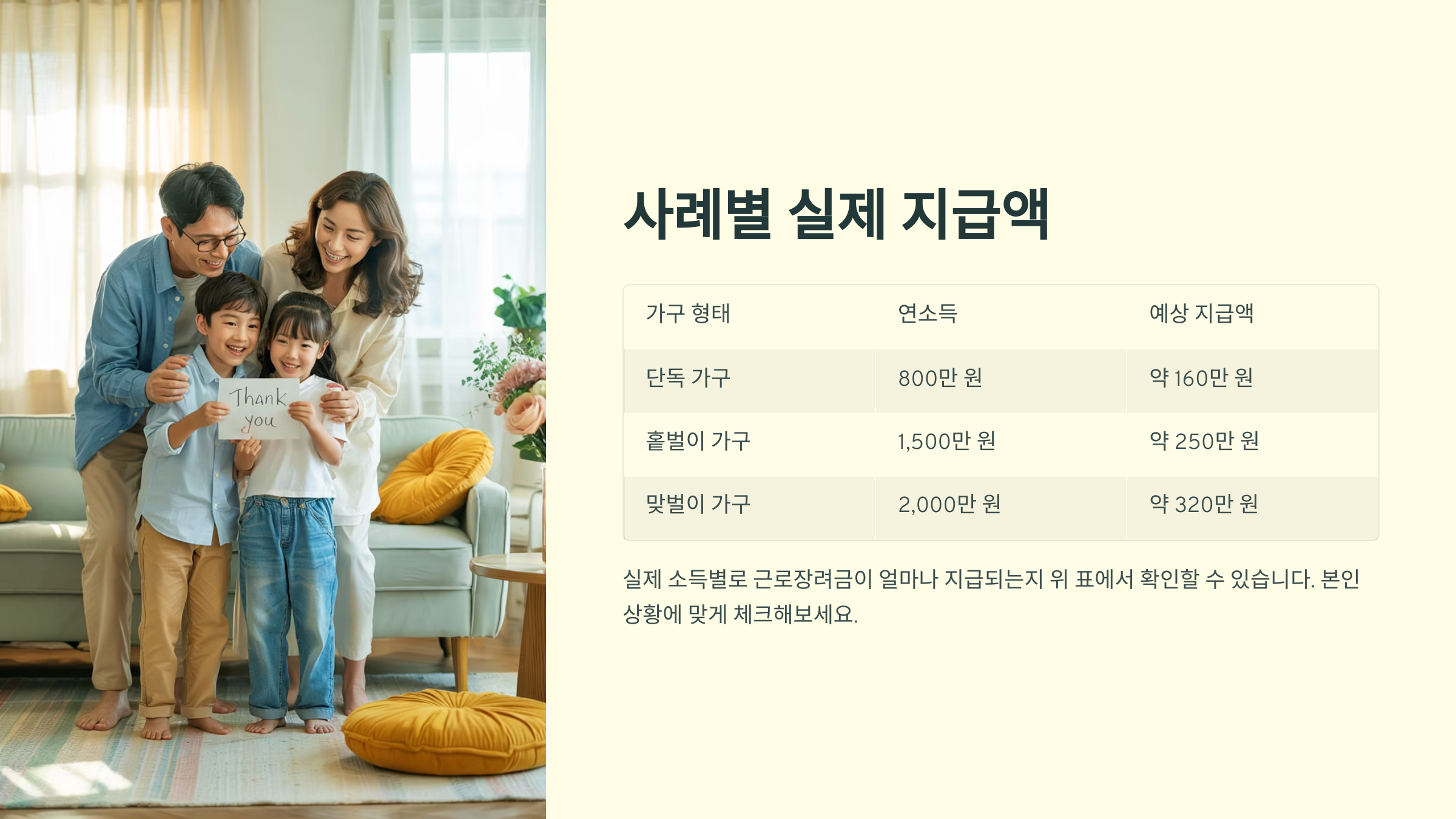 실제 소득별로 근로장려금이 얼마나 지급되는지 구체적인 예시를 보면 이해가 훨씬 쉬워요. 다양한 상황별로 지급액을 예측해볼게요!