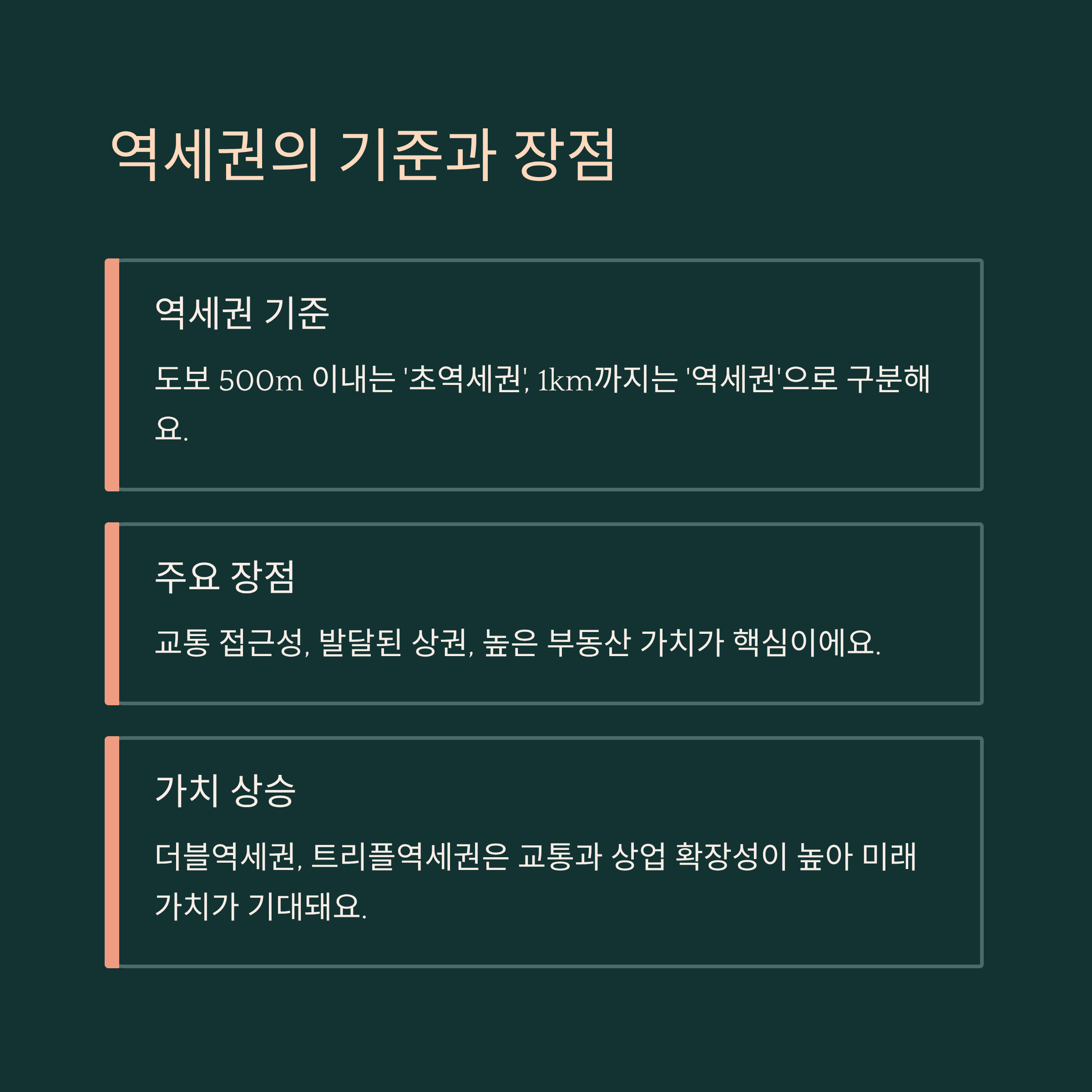 | 역세권 | 1km 이내 | 도보 10분 | 우수 | 높음 |