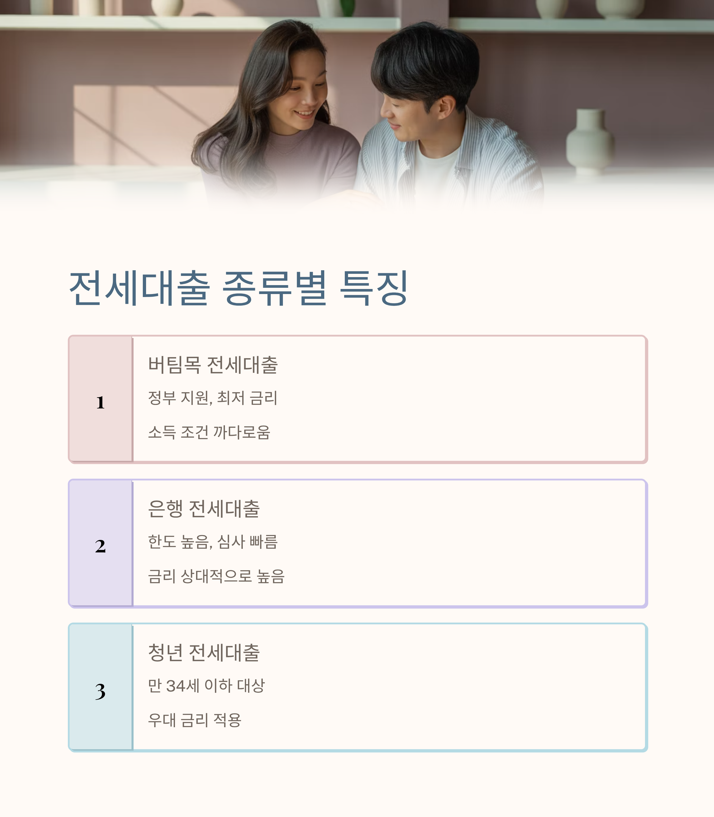 전세자금대출은 크게 3가지로 나뉘어요. 정부지원 대출, 청년·신혼부부 특화 대출, 그리고 일반 보증형 대출이에요. 각각의 상품은 목적과 대상, 금리와 조건이 다르기 때문에 나에게 맞는 상품을 고르는 게 가장 중요해요.