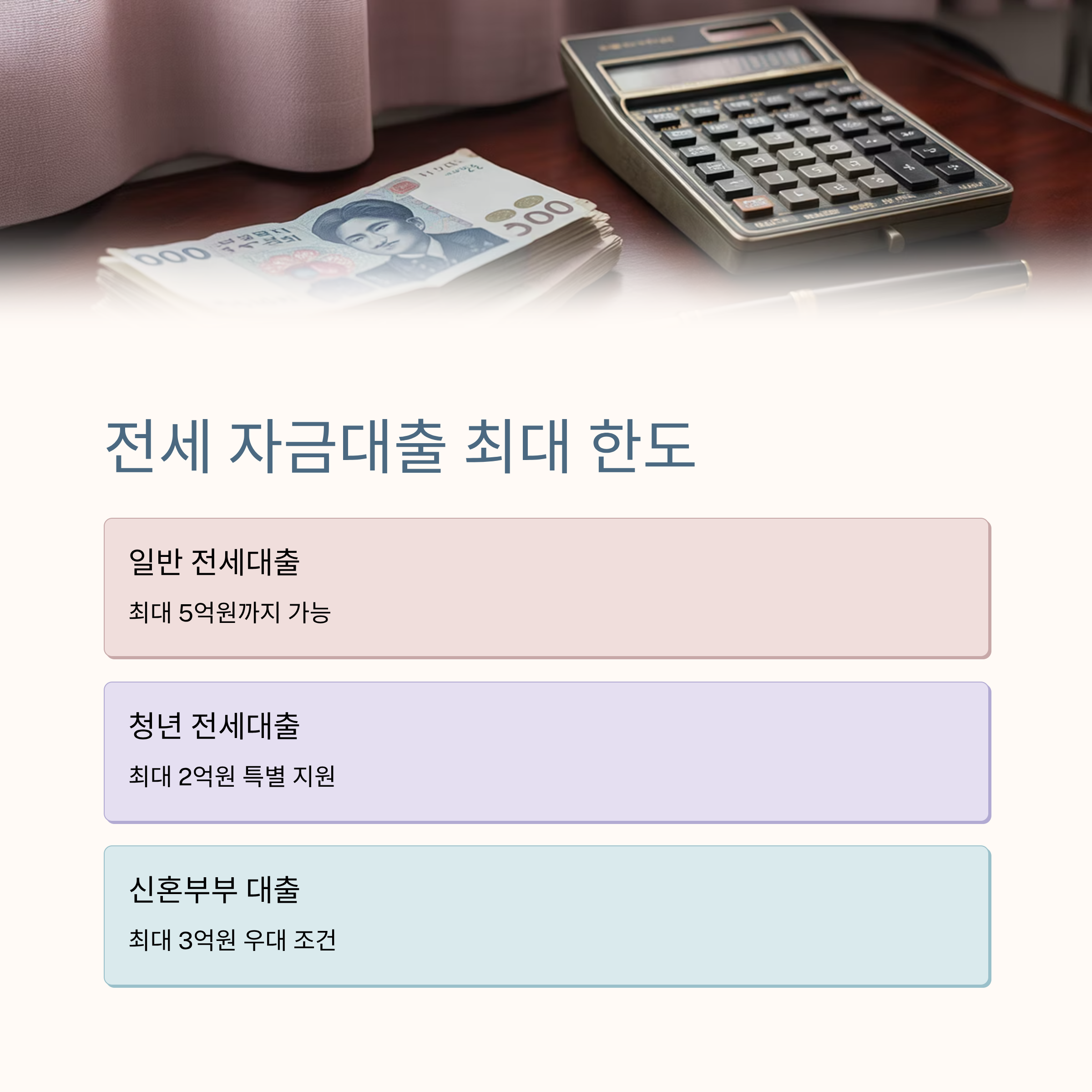 2025년 기준으로 전세 자금대출 최대 한도는 대출 상품의 종류, 소득 수준, 전세보증금, 보증기관의 심사에 따라 다양하게 달라져요. 가장 많이 이용되는 세 가지 유형은 아래와 같아요.