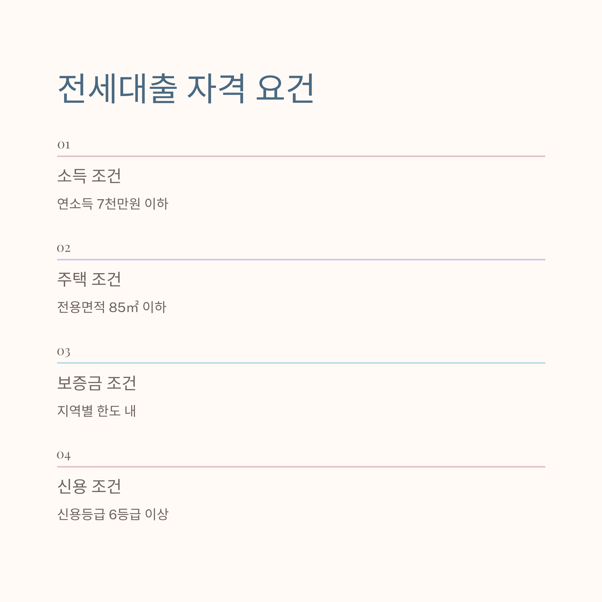 전세 자금대출을 받기 위해선 단순히 ‘전세 계약서’만 있다고 가능한 건 아니에요. 대출 상품마다 요구하는 자격이 모두 다르기 때문에, 신청 전 본인의 조건이 해당 상품에 부합하는지 먼저 확인해야 해요.