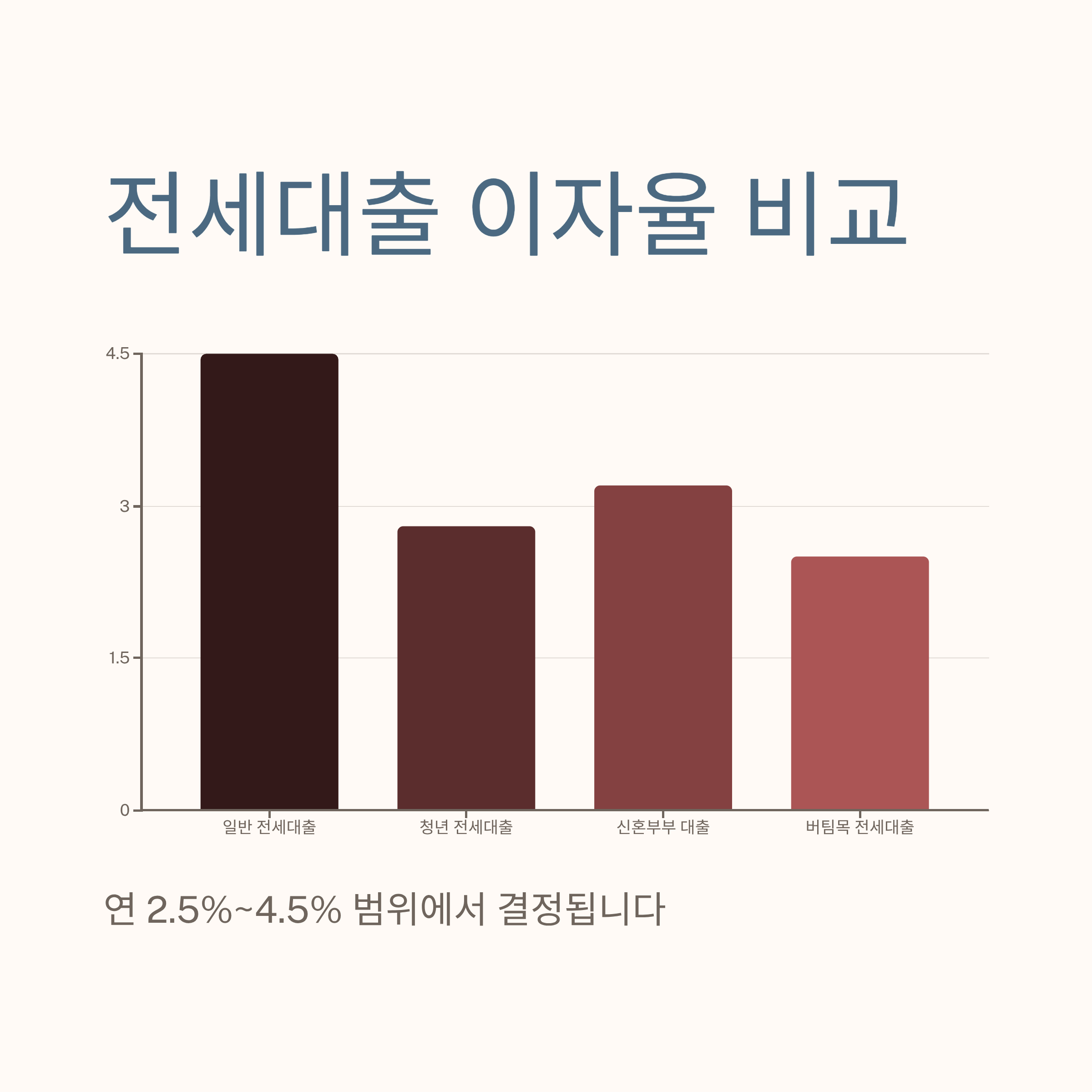 반면 일반 전세대출은 보증기관 및 대출받는 은행에 따라 3.4%~5.5%까지도 가능해요. 신용등급이 좋고 소득이 안정적이라면 낮은 금리를 적용받을 수 있지만, 그렇지 않으면 이자 부담이 꽤 커질 수 있어요.