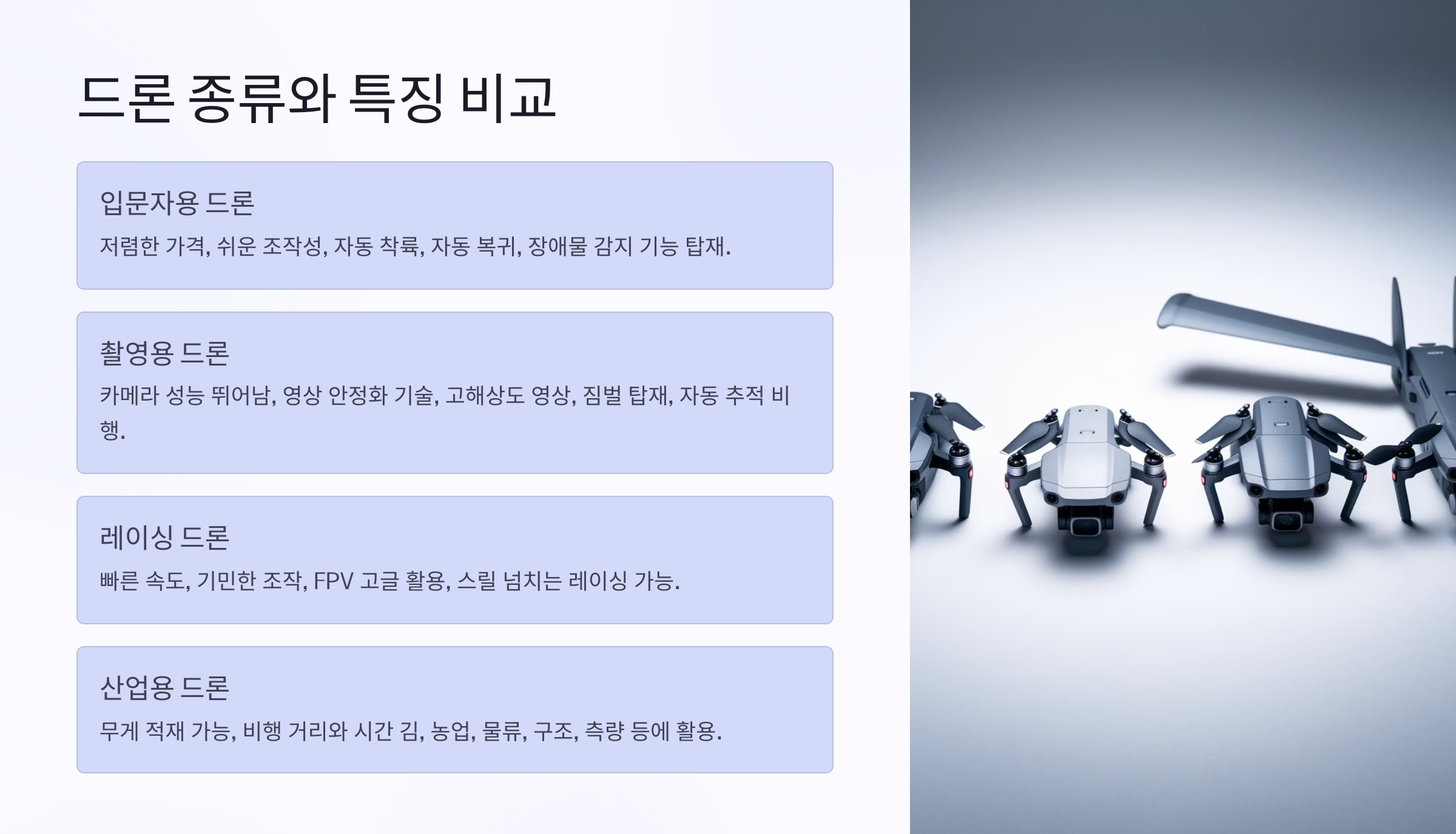이렇게 장단점을 잘 이해하면 드론을 더 똑똑하게 사용할 수 있어요. 다음은 드론 종류와 특징을 비교해볼게요! 바로 넘어가볼까요? 🚁
