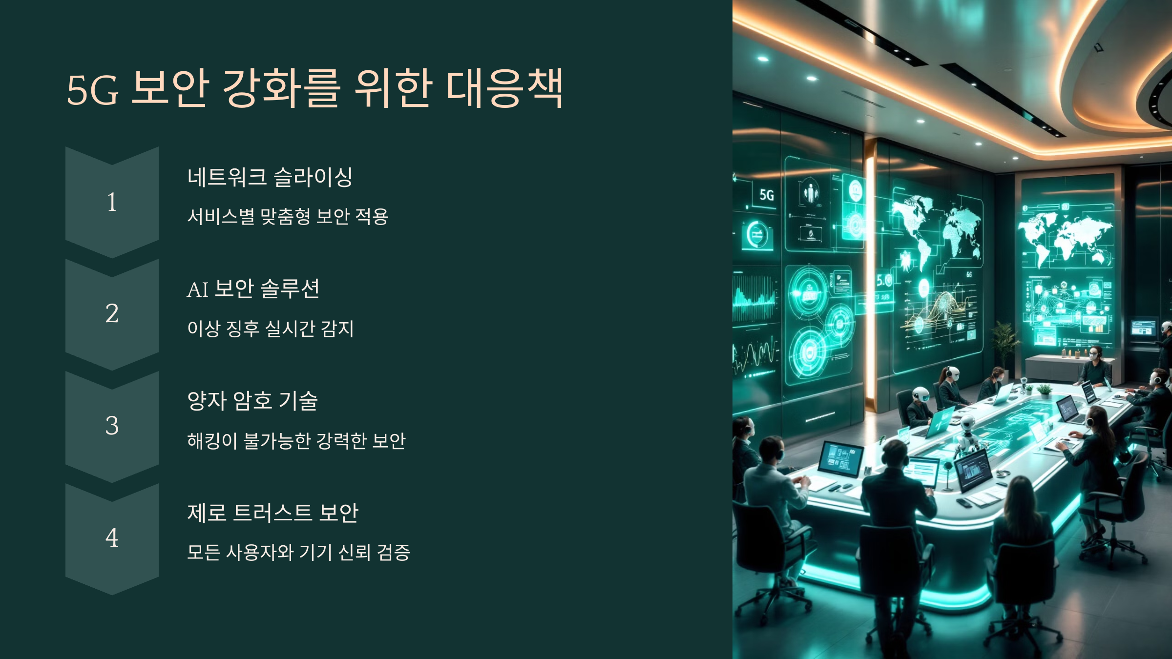 A6. 네트워크 슬라이싱 적용, AI 기반 보안 솔루션 도입, 제로 트러스트 보안 체계 구축, 주기적인 보안 감사 등이 필요해요. 🏢