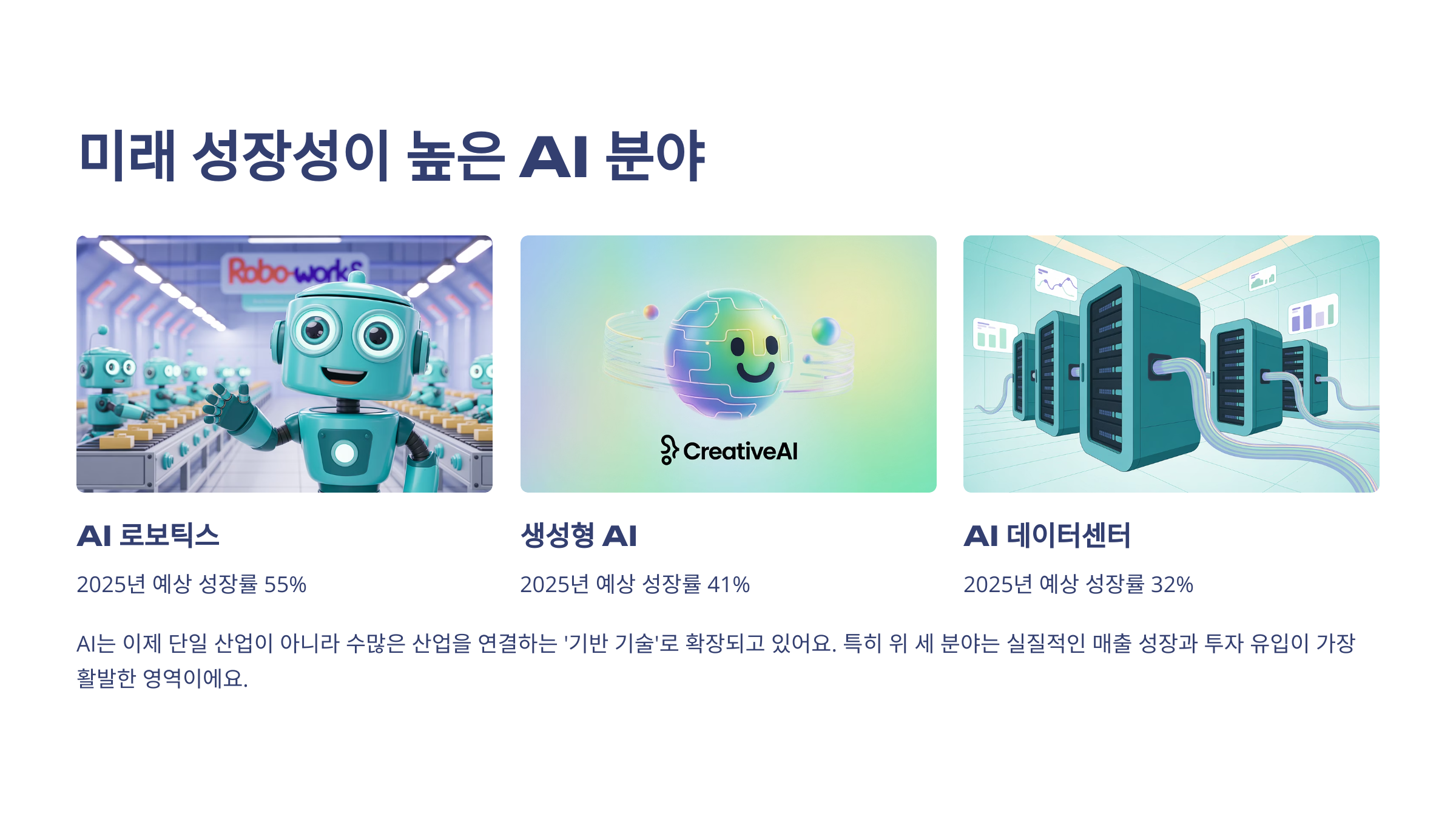 이 세 분야는 단순히 “AI”라는 이름이 붙은 게 아니라, 실질적인 매출 성장과 투자 유입이 가장 활발한 영역이에요. 앞으로 3~5년간 투자 비중을 늘려야 할 핵심 산업이라고 볼 수 있어요.